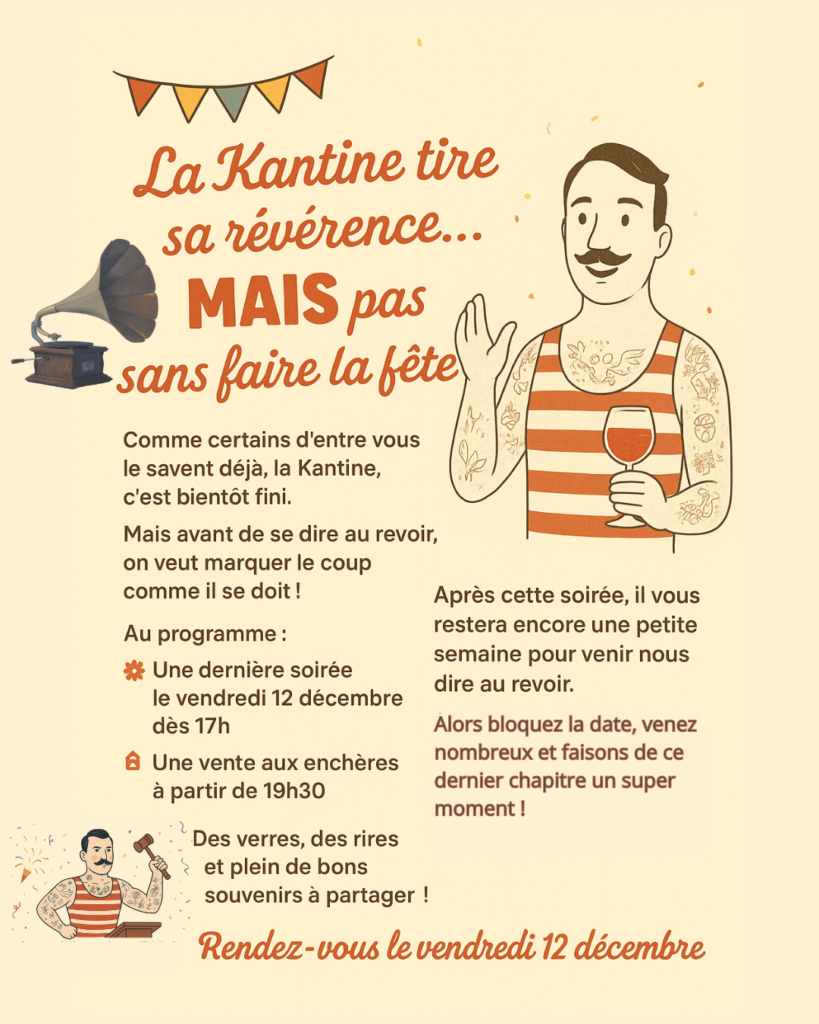 Si vous voulez privatiser la Kantine; un petit mail, un coup de téléphone ou une rencontre pour en discuter.